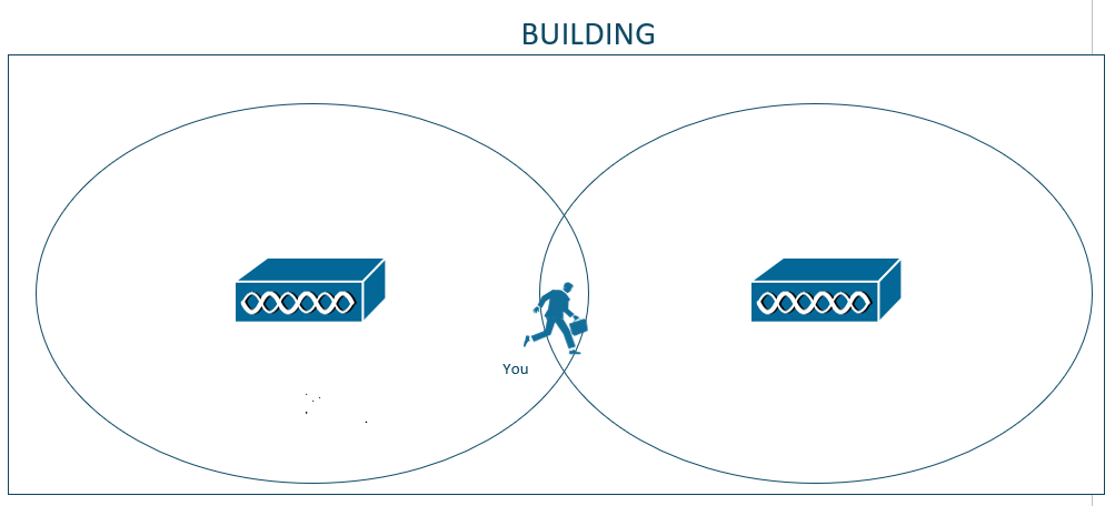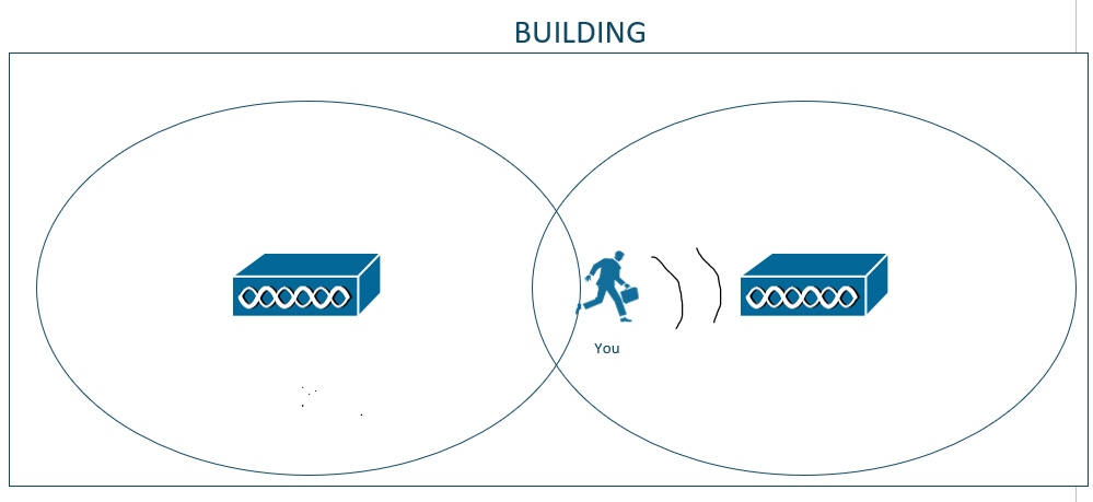 If you are located on the left side of the building, you will associate to AP-1. However, what happens if you move around the building? If you decide to walk around the building and you happen to move further to the right