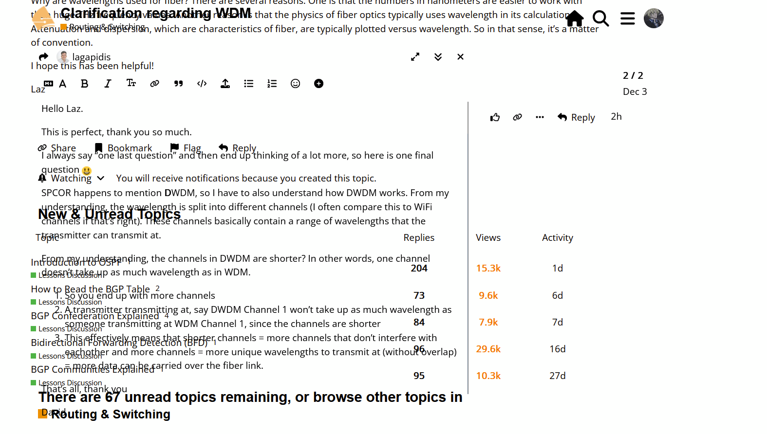 SPCOR happens to mention DWDM, so I have to also understand how DWDM works. From my understanding, the wavelength is split into different channels (I often compare this to WiFi channels if that’s right). These channels basically contain a range of wavelengths that the transmitter can transmit at.