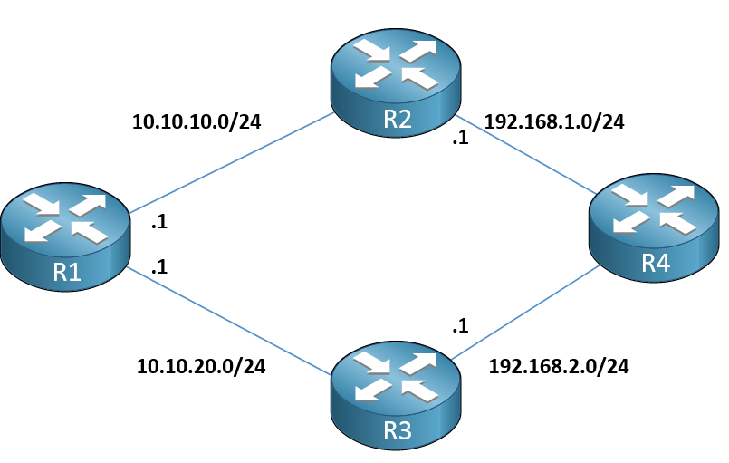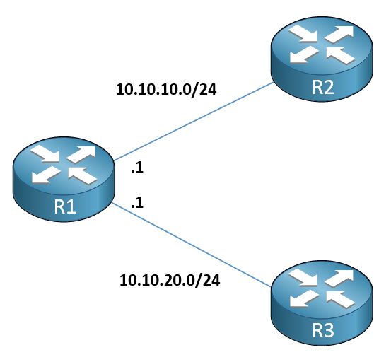 R2 would receive an advertised default route with a next hop IP of 10.10.10.1 while R3 would receive an advertised default route with a next hop IP of 10.10.20.1.