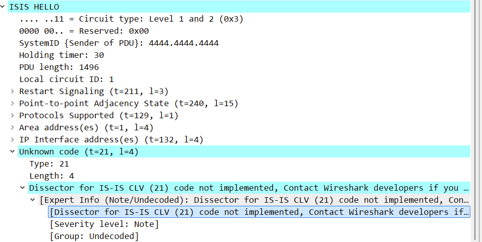 Now, another question that comes up is, why does there seem to be another encapsulated packet called ISIS HELLO? Is this another Layer? Well, no, it isnât. Itâs still part of the IS-IS Layer 3 PDU, but Wireshark chooses to display it as a separate entity. Strictly speaking, it is still part of the L3 PDU. This is just a display issue.