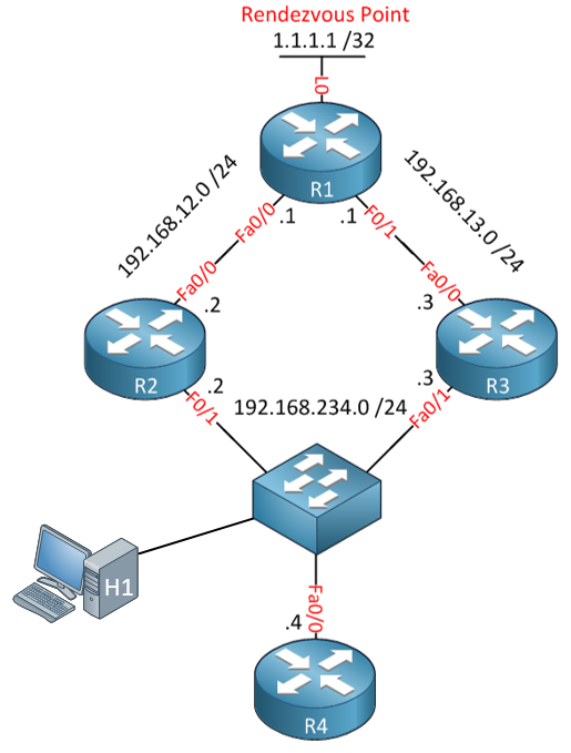 This topology is implemented with sparse-mode , and the R1âs lo0 (1.1.1.1) configured statically in all routers as the RP.