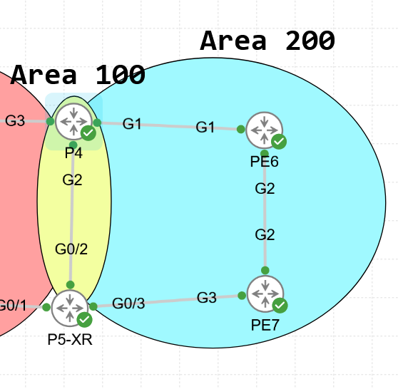 To mitigate this, we can literally configure the interfaces between P4 and P5-XR to be part of both Area 100 and Area 200.