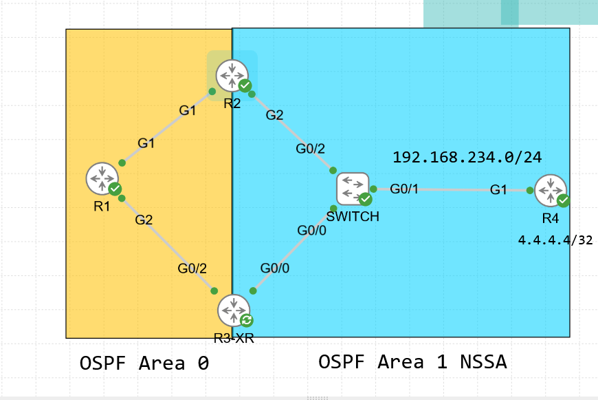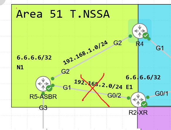 R5 is redistirbuting 6.6.6.6/32 into Area 51 as a N1 route and advertising this to R4. I’ve also configured R2-XR to redistribute that exact same network as a E1 route (I’ve cut the link to Area 51 for R2-XR because it would advertise the route as N1 there). The blue area on the right is a normal area and R4 is receiving the E1 route there.