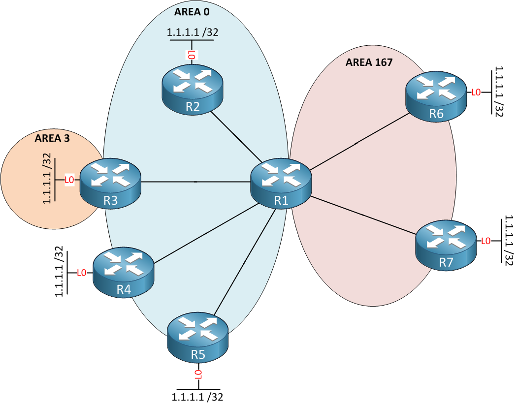 Now, I will configure this exact same network on R7-XR (so R3 will also receive a intra-area route). I will give it a very high cost.